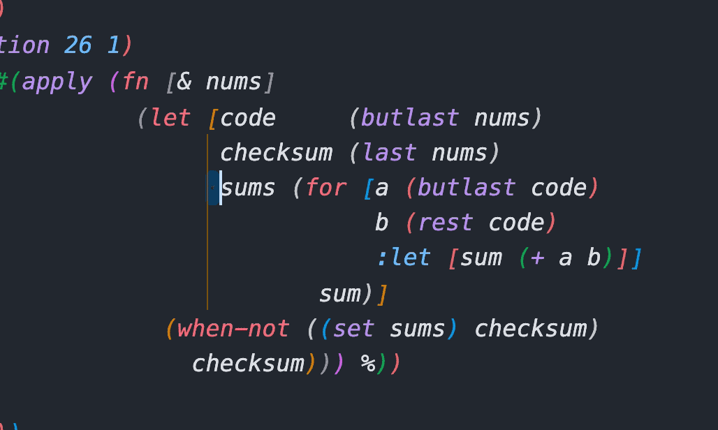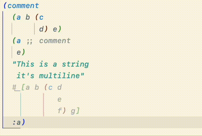 Calva Paredit helps you navigate, select and edit Clojure code in a structural way. LISP isn't line or character oriented, it is based around S-expressions, a.k.a forms. We strongly recommend that you take advantage of the structural nature of Clojure, and have therefore put a lot of work into making Calva Paredit extra awesome.